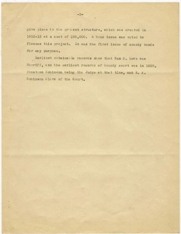A bond issue was voted to finance this project. It was the first issue of county bonds for any purpose. Earliest obtainable records show that Sam B. Love was Sheriff, and the earliest records of County court was in 1826, Jonathan Robinson being the Judge at that time, and E. A. Robinson Clerk of the Court.